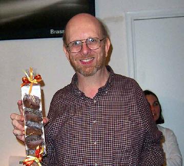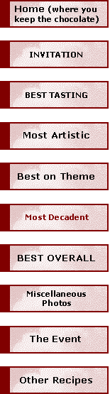 The flourless chocolate cake was from the Scharffen Berger website, but with 8 oz of Ghirardelli chocolate chips added to the batter before pouring it into the pan. Note that the test for done doesn't work if you