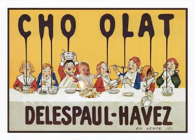 (Luc's daughter, Melanie, had her first birthday, auspiciously enough, on the day of the chocolate tasting, and he's very proud that she's a chocolate lover. Since I always felt sad for the kid crying because the 'C' wouldn't melt, I decided to replace him with happy Melanie who was more than happy to take care of the 'C'.)