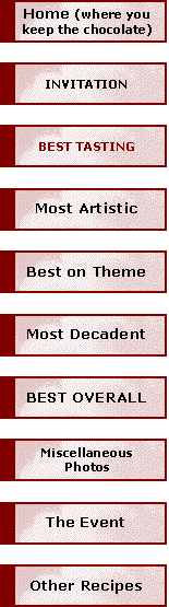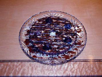 Tart Shell: (Note from Susan: This is a standard sweet pastry dough. I suggest substituting a chocolate/hazelnut dough, but since I made up the recipe and I doubt most folks can find hazelnut flour, this one should be ok. I changed the instructions to something quicker. Those familiar with the more time-consuming approach to making pastry can certainly do it that way.) 2 T sugar 3 cups flour 1/4 teas salt 3 sticks sweet butter 3 T cold water (Note from Susan: I suggest using liqueur of some sort, like Frangelico) Put sugar, flour & salt in processor and mix. Cut butter in pieces and add to process, then mix until just blended. Drop water in a little at a time until ball forms. Press evenly into a 9" tart pan (kind with removable bottom). Chill for 1 hour or more. Line with parchment and beans/pie weights and bake at 350 for 8 minutes, remove weights and cook another 8 minutes until golden. Cool.