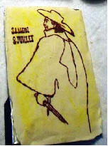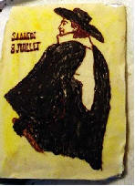 Melt some chocolate for the large areas of your painting. In my case, I melted some very dark chocolate, and mixed in some black paste food coloring. In retrospect, I think I could have brushed the black on after it dried. I used a butter knife to spread this chocolate on the canvas. The outline you made helps contain the chocolate in that area. After it dries, if you prefer a more matte finish, you can scrape it a bit with a sharp knife. For vivid colors, you can use fruit like berries, and stick it on with some melted chocolate. I used cut fresh raspberries for the scarf. (I was going to frame it with Toblerone, but thought I'd quit while I was ahead). |