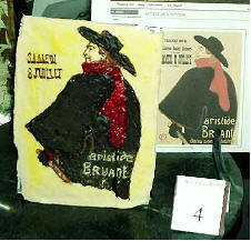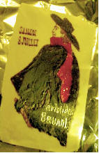 First, choose a painting to copy that is simple and has a limited number of colors. It's not easy coloring chocolate. Create your canvas out of dark or white chocolate, depending on your painting. Melt the chocolate in a dish over simmering water in a pan, then spread it in a rectangular pyrex or metal pan lined with waxed paper or parchment. Don't attempt to mix conventional food coloring into chocolate, as any liquid will cause it to seize up. Spread the chocolate evenly in the pan, press another piece of waxed paper on top, then chill to firm up. Make sure to press out any air bubbles. (I made this the night before.) If you would like to mount the "canvas" on a prop, take the back out of a picture frame and cover it with foil, except for the stand, which must be able to stick out in back. Take the chocolate slab out of the refrigerator and place the frame back on top of your "canvas" and the waxed paper. You'll want to cut around the frame back to make your canvas the same size. Place the pan with the slab in it over a flame to melt the chocolate a little bit, then grab the waxed paper (under the slab) and lift it out. Flip it over onto your hand and peel the paper off the melted side, then flip it back onto the frame back and press it. Put it back in the refrigerator to harden onto the frame back.